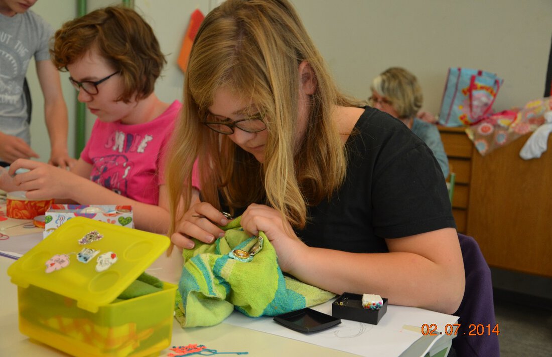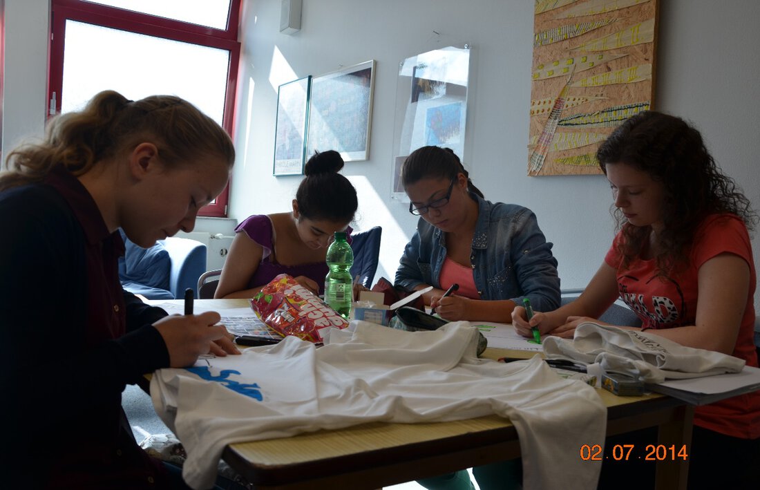 Die Teilnehmer des Workshops lassen ihre Kreativität in Stoffe fließen. Sie gestalten T-Shirts mit möglichen Schullogos und verwandeln alte Kleidungsstücke in neue trendige Unikate. In der Nähstube werden Taschen, T-Shirts und weitere Klamotten gefertigt, währenddessen plant das Vorbereitungsteam die Modenschau, die am Ende der Projekttage stattfindet. Um die Vorbereitung perfekt abzuschießen, nähen die Teilnehmer fleißig die Stoffe.