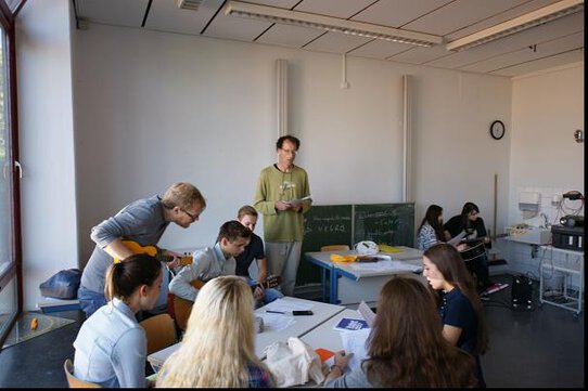 Hier wird viel musikalisches Denken in kreative Energie umgesetzt. Herr Borgmeier mit seiner gelben Ukulele vorne dabei.