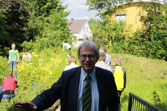 Die Schüler arbeiten fleißig an der Beseitigung von Unkraut, dem Umgraben der Beete und Einsetzen der Pflanzen. Auch Herr Gahlen stattet dem Schulgarten einen Besuch ab und erkundigt sich bei den Fachlehrern, wie die Stimmung und das Engagement in dem Workshop sind.