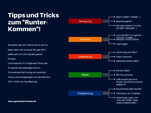 Der Religionskurs der Klassen 5 von Frau Mensing hat insgesamt 15 Tipps und Tricks zum "Runter-Kommen" erarbeitet und anschaulich zusammengetragen. Wer also einmal seine negative oder überschüssige Energie ableiten möchte, kann jeweils drei Tipps und Tricks von fünf Kategorien ausprobieren. Berichtet gerne, welche die erfolgreichsten waren.