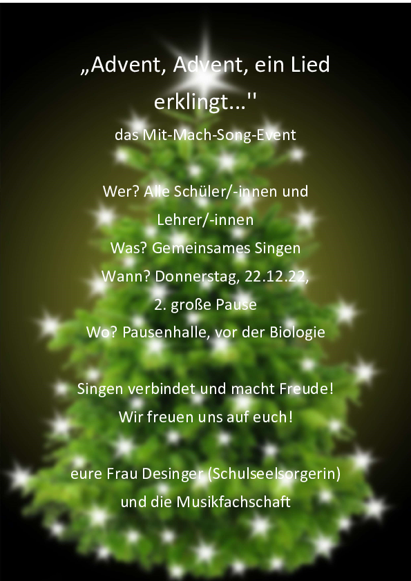 an diesem Donnerstag (22.12.2022) findet in der zweiten großen Pause ein gemeinsames Singen für alle Schülerinnen und Schüler sowie alle Lehrerinnen und Schüler in der Pausenhalle (vor der Biologie) statt.
