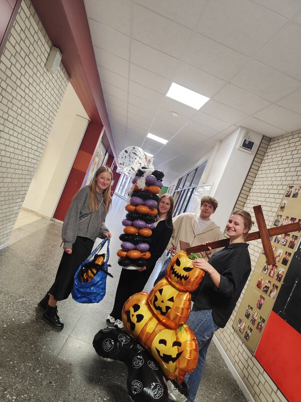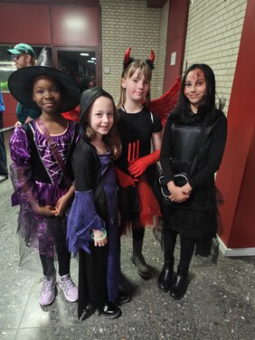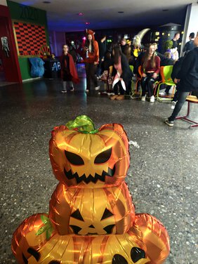 Schon beim Betreten der geschmückten Schule konnte man die gute Stimmung spüren: Überall hingen Spinnennetze, Kürbisse leuchteten und viele gruselige Kostüme tanzten durch die Schule.