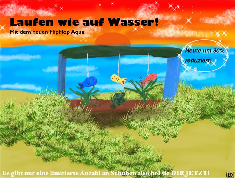 Nachdem wir unsere Produkte fertig gestellt hatten, haben wir uns mit dem Thema Werbung beschäftigt. Wir haben uns wichtige Aspekte der Werbung erarbeitet und diese dann in Form einer eigenen Flip-Flop-Werbeanzeige angewandt.