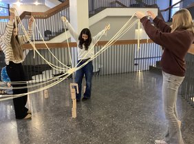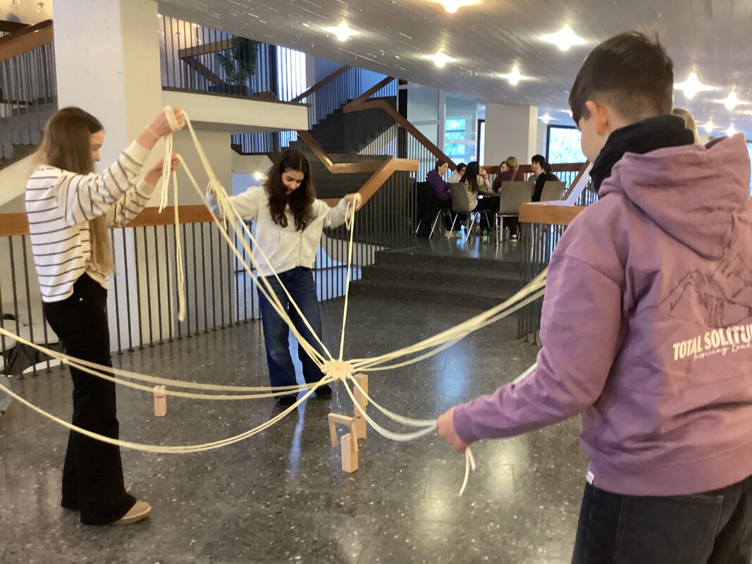 Der erste Tag stand unter dem Motto „Teambuilding“. In Kleingruppen durchliefen die Schülerinnen und Schüler verschiedene Stationen im Aulafoyer, an denen Zusammenarbeit, Kommunikation und gegenseitige Unterstützung im Mittelpunkt standen. Die Aufgaben reichten von sportlichen Aktivitäten, wie etwa einem Tauziehen in Kombination mit dem Erraten von Begriffen, die von Teammitgliedern gezeichnet wurden, über koordinatorische Herausforderungen wie den Bau eines Fröbelturms bis hin zu kreativen Übungen, bei denen ein Bild nach einem Bilddiktat der Partnerinnen und Partner umgesetzt werden musste.