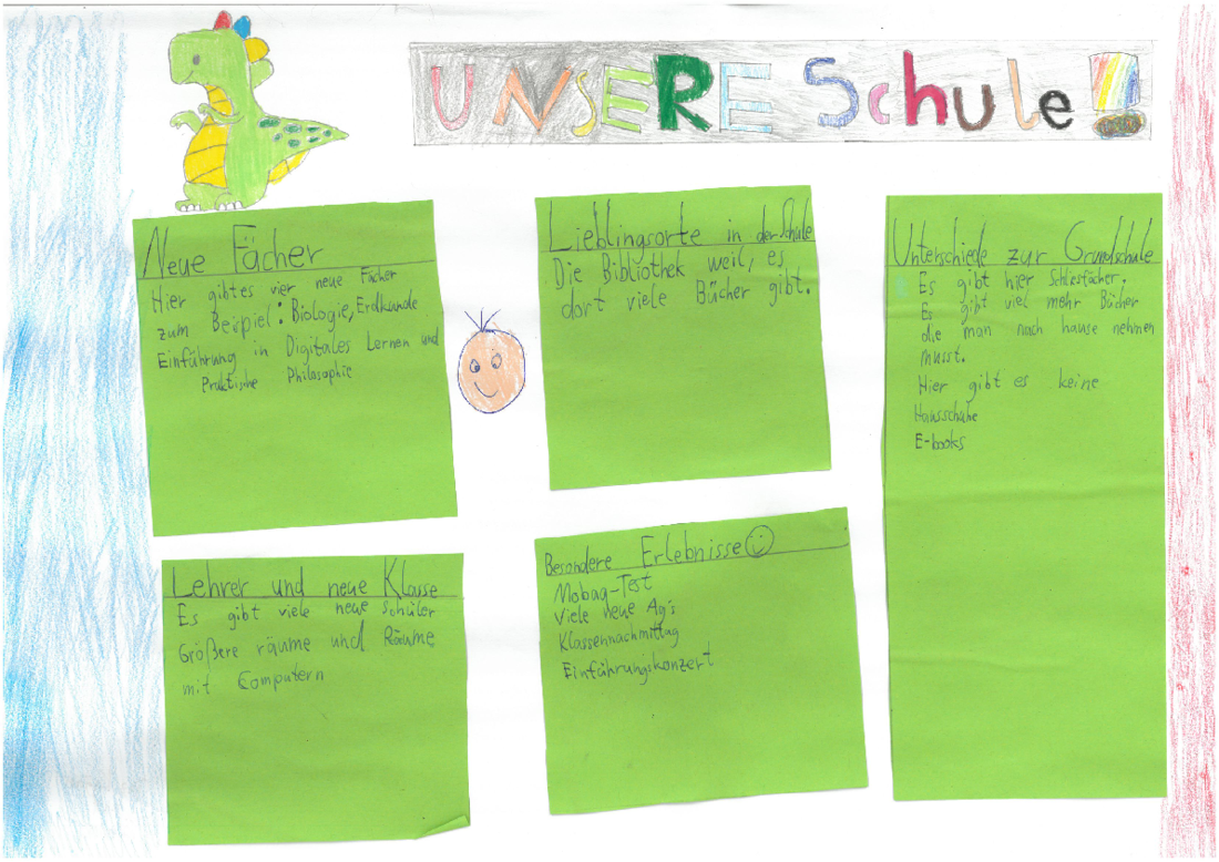 Mit Zeichnungen und Texten haben sie persönliche Eindrücke festgehalten und zeigen, was unsere Schule für sie so besonders macht. Schaut euch die Plakate unserer Fünftklässler an und entdeckt, was unsere Schule alles zu bieten hat!