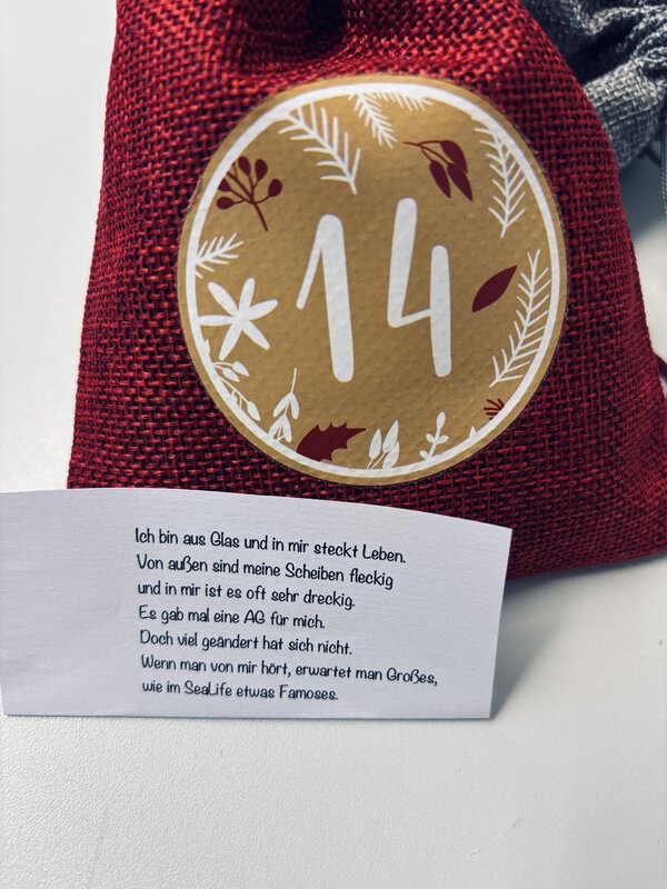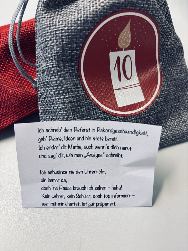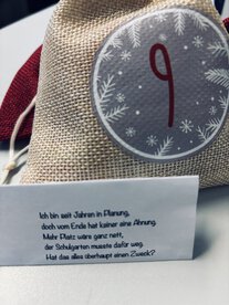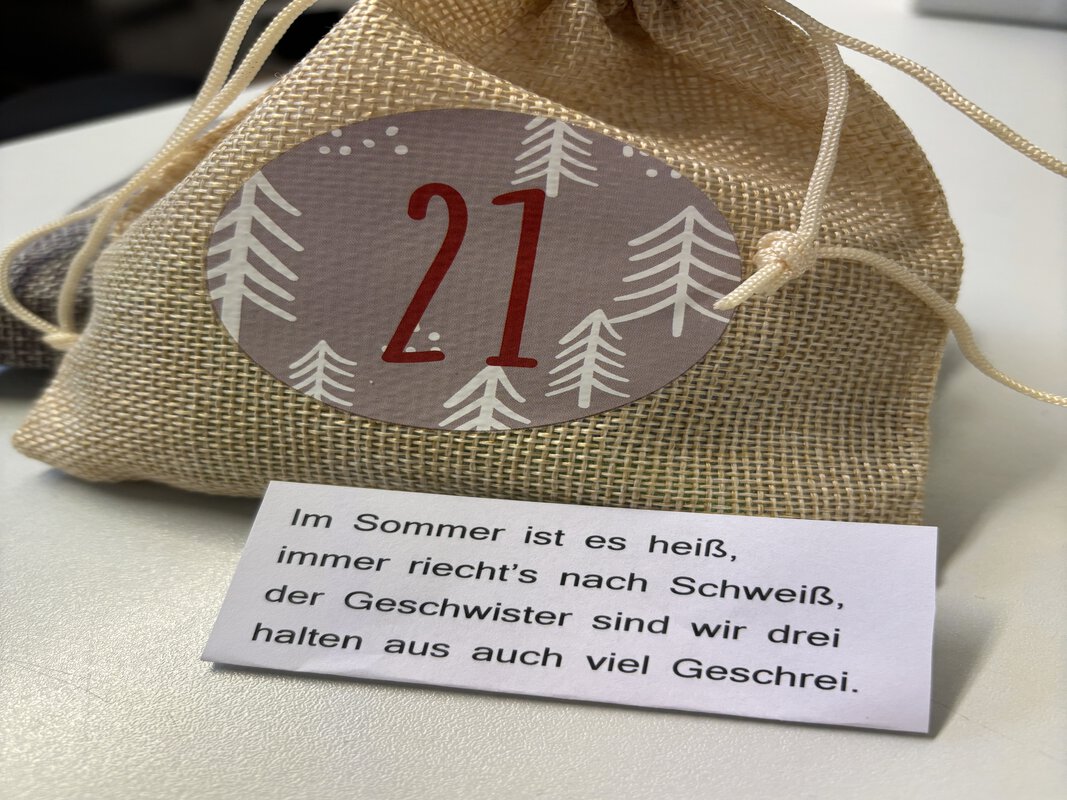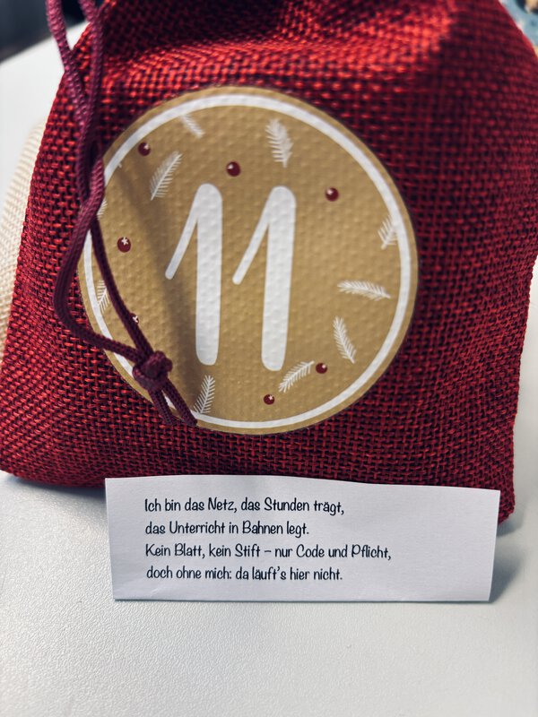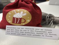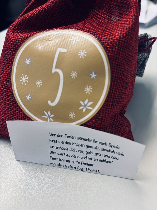 Werft euren Tipp bitte mit Datum, Namen und Klasse in die Adventskalender-Box im Sekretariat. Es gibt leckere Überraschungen zu gewinnen...